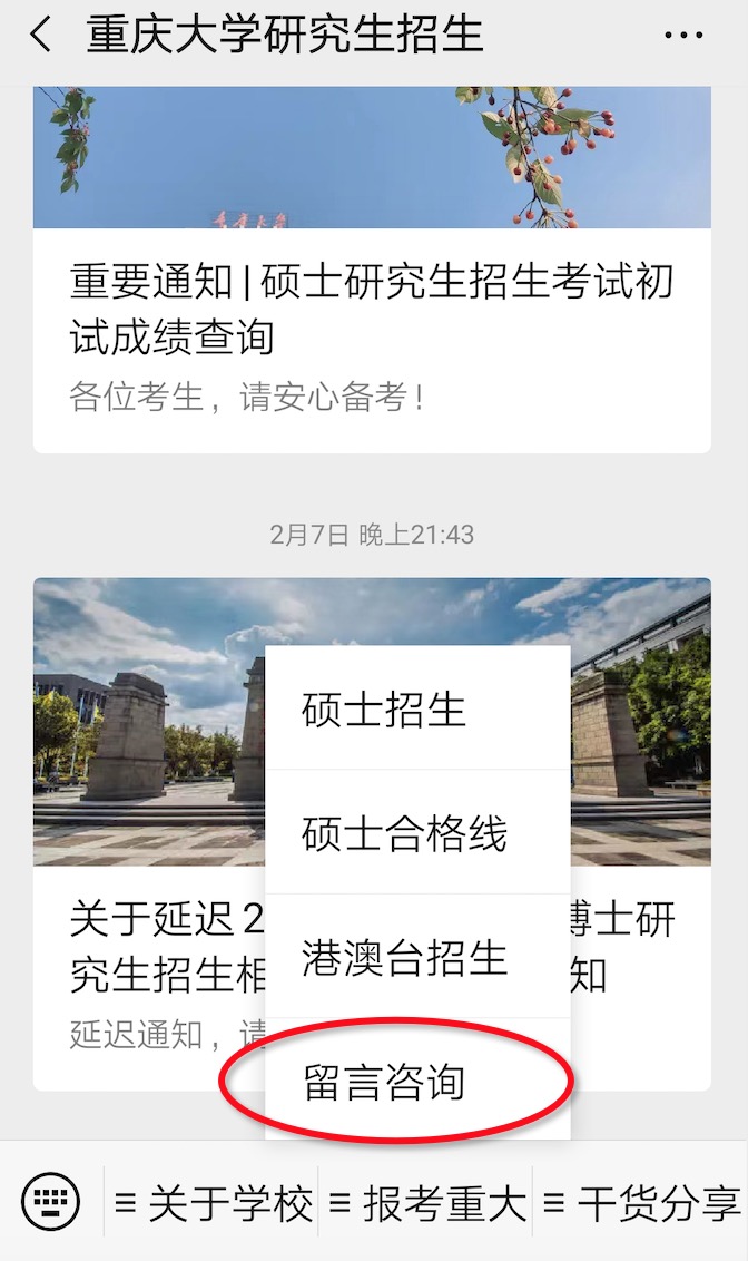 第二步:在下方菜单栏,点击“报考重大”进入“留言咨询”