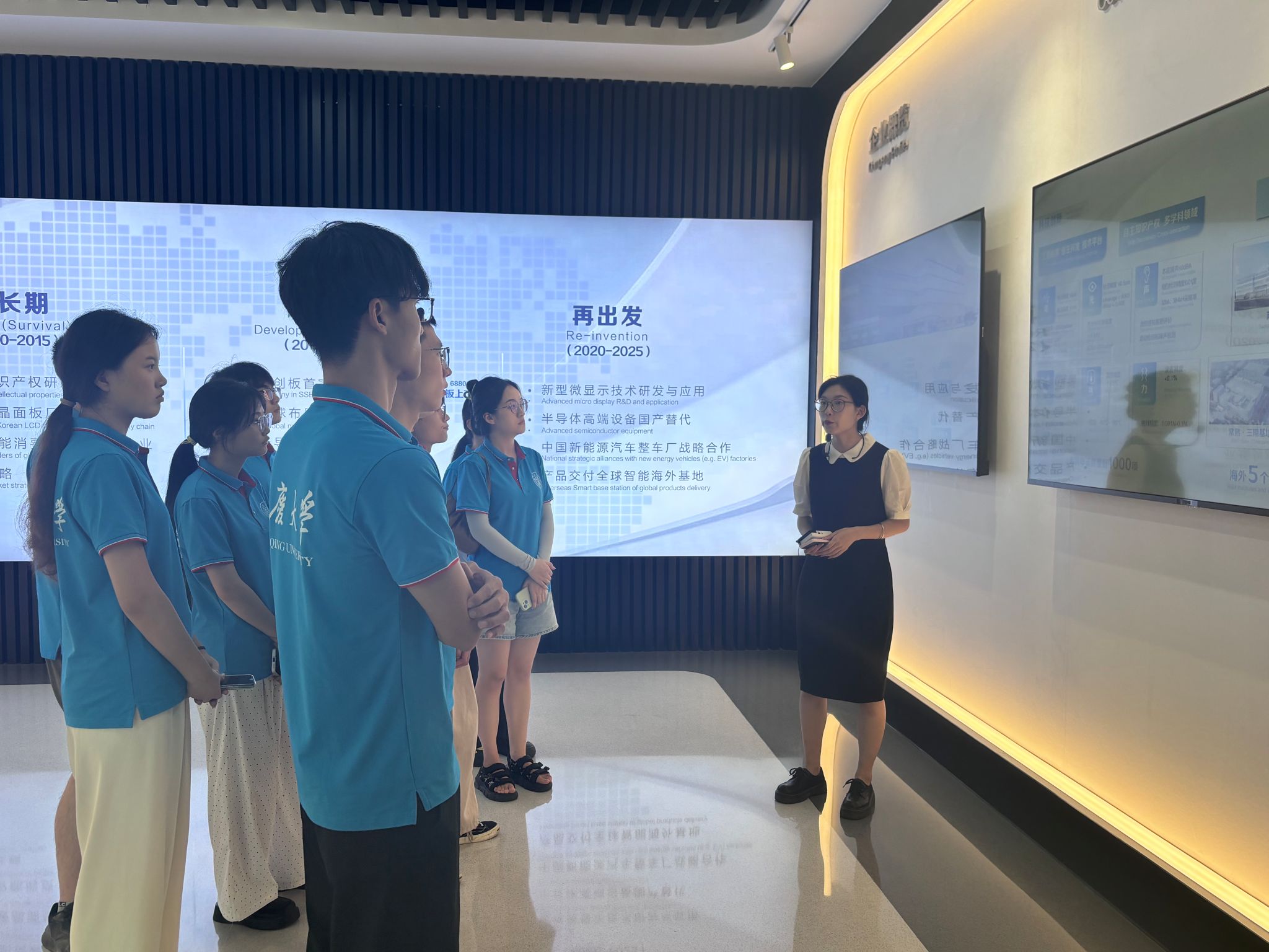 在解说员的引领下,实践团重走了习近平总书记2023年7月在华兴源创考察时的路线。解说员生动讲解了展厅中各种高精尖检测设备的工作原理和应用成果,涵盖了OLED、LCD、半导体和新能源汽车检测等多个技术前沿领域,全面展示了华兴源创卓越的技术实力和创新能力。创业19年来,华兴源创荣获了企业技术中心和制造业单项冠军等多项省级、国家级荣誉,荣誉墙上的证书和奖杯无不彰显着华兴源创在“创”造、“智”造和“质”造方面的突出成就。