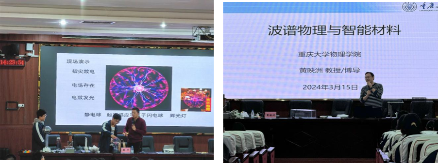 第二场讲座《波普物理与智能材料》由黄映洲教授主讲。黄教授的讲座不仅向学生们展示了物理学的科技前沿,还深刻阐述了物理知识如何服务于社会和日常生活。此次讲座极大地拓宽了学生们的视野,激发了他们对科学探索的热情,加深了对物理学在现代世界中不可或缺作用的理解。黄教授的深入讲解和案例分析,让学生们认识到物理学不仅是学术领域的研究,更是推动社会进步和创新的重要力量。