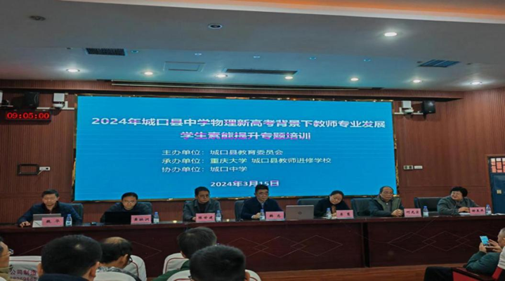 特派由党委书记韩忠,教学副院长陈世建,大学物理实验中心主任何光宏,重庆市重点实验室副主任黄映洲和物理系副主任魏华组成的专家指导团队,于2024年3月15日到城口中学开展了“启智润心 筑梦未来”主题系列活动之“2024年城口县中学物理新高考背景下专业发展、学生素能提升专题培训”活动,对城口县80余名初高中物理教师进行了专业培训,为近200名高中学生代表给予了学习指导。