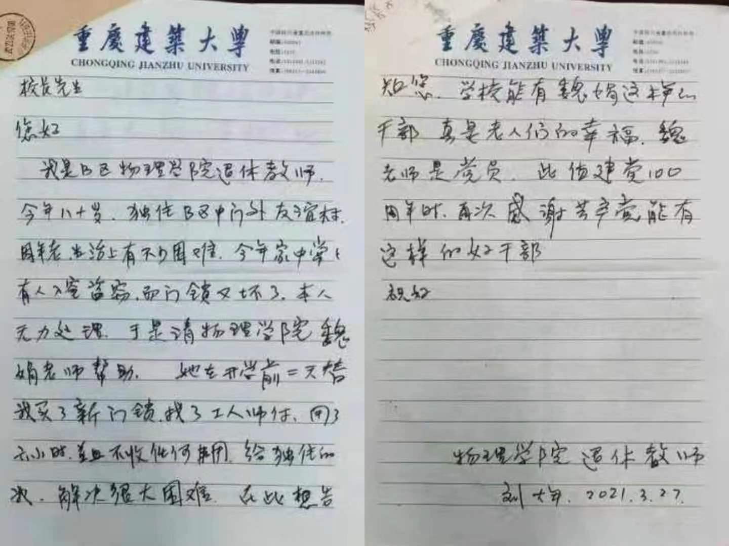 随后刘老师将自己的感激之情写了一封表扬信投给了校长信箱,她表示“学校能有魏娟这样的干部真是老人们的幸福,魏老师是党员,此值建党100周年时,再次感谢共产党能有这样的好干部”。张宗益校长手写批复“转告性爱影片