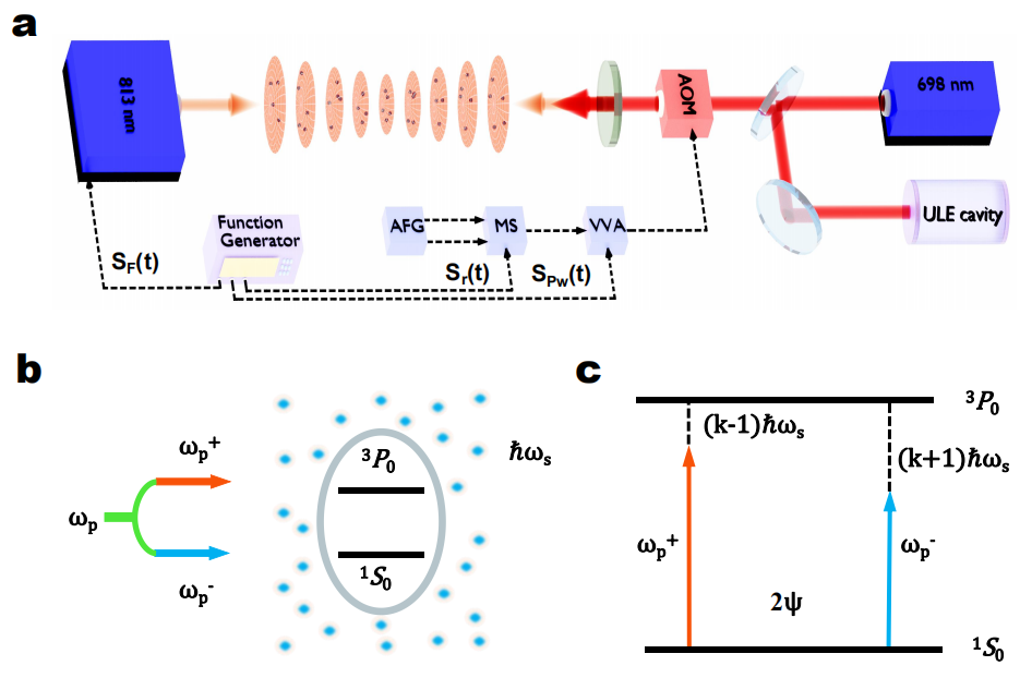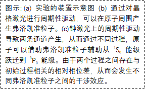 作为下一代时间标准的重要候选者之一,锶原子光晶格钟平台具有超强稳定性和超高准确性等特点,它也是量子精密测量的利器,可精确探测相对论红移效应以及引力波等。根据弗洛凯(Floquet)理论,当一个量子系统被周期性驱动时,会激发出弗洛凯准粒子;如果采用两种不同的模式同时驱动,所产生的弗洛凯准粒子间的相对相位可导致量子干涉效应。但至今,人们一直未观测到这种量子干涉效应。