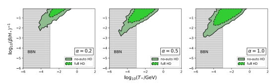 (边立功副研究员)与中科院理论物理研究所、紫金山天文台、国家天文台、新疆天文台、北师大珠海校区和PPTA实验组等合作,首次利用PPTA的最新数据集寻找早期宇宙的低能标相变(MeV尺度)。该研究给出了PPTA数据集对早期宇宙相变温度、相变强度和相变持续时间等参数的约束(见下图)。论文被编辑推荐发表在物理学顶级期刊Physical Review Letters上,并被美国物理学会《Physics》杂志专题报道。该研究得到了国家自然科学基金委、重庆市自然科学基金、中央高校基本科研业务费-前沿科学与颠覆性卡脖子技术研究子项等的支持和资助。