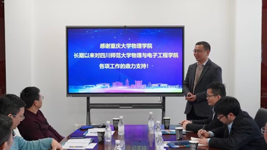 的大力支持表示感谢,并提出以高水平科研合作为突破点,携手申报国家重大科研项目、共育国家级高层次人才的愿景,以期全面提升四川师范大学物理与电子工程学院的师资队伍实力与科研创新能力。胡自翔强调了双方可以在高水平科研平台建设、拔尖创新人才培养、高水平师资队伍建设等方面开展全面合作,互学互鉴,共谋发展。