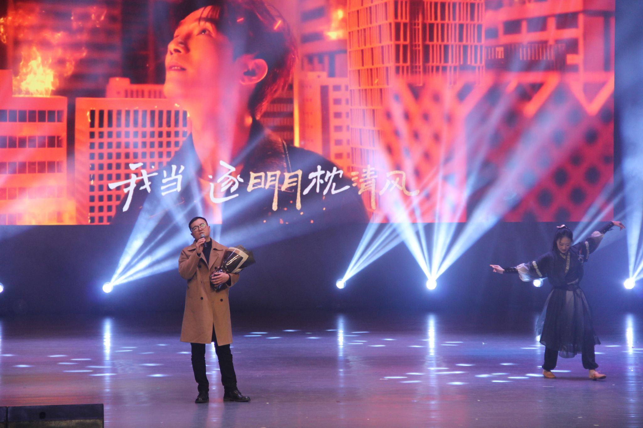 街舞社带来的《work》以潮流舞姿拉开晚会序幕,动感节奏瞬间点燃全场;六名学生带来的歌曲串烧《青春交响》以青春曲风衔接多首佳作,节奏明快、活力满满,展现出当代青年的蓬勃朝气;相声《欢声笑语》以传统曲艺形式,在诙谐幽默的表达中讲述校园生活;峨眉山市检察长汪恒登台献唱歌曲《庙堂之外》,以沉稳深情的嗓音跨界演绎,为现场注入了一份温暖而坚定的力量;学生乐队演绎的《都选 C》以激昂摇滚曲风搭配强劲节奏,再度点燃全场热情。