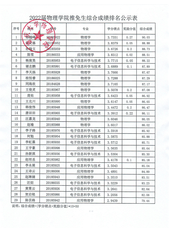 根据学校《关于开展2022年推荐优秀应届本科毕业生免试攻读研究生工作的通知》和《性爱影片 本科毕业生推免攻读硕士研究生实施细则》的相关规定,经过报名、初审、公开答辩程序,现将性爱影片 2022届推免生综合成绩排名予以公示: