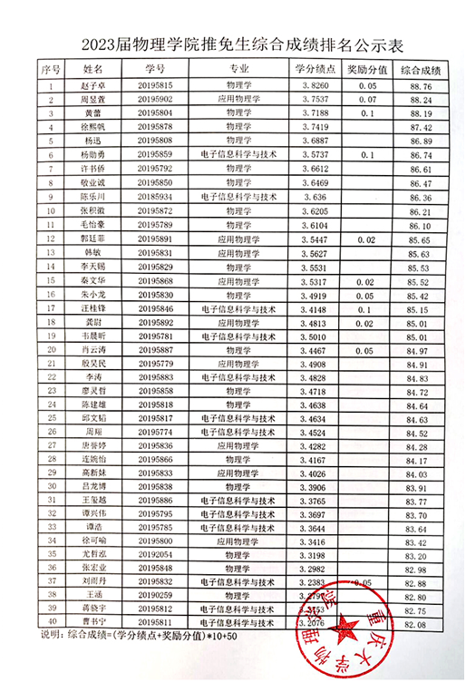 根据学校《关于开展2023年推荐优秀应届本科毕业生免试攻读研究生工作的通知》和《性爱影片 本科毕业生推免攻读硕士研究生实施细则》的相关规定,经过报名、初审、公开答辩程序,现将性爱影片 2023届推免生综合成绩排名予以公示: