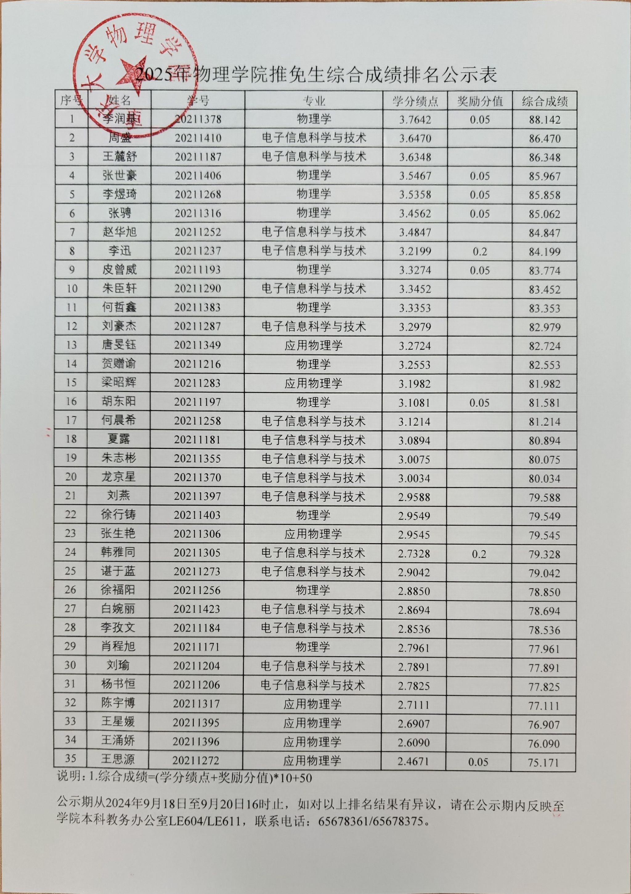 根据学校《关于开展2025年推荐优秀应届本科毕业生免试攻读研究生工作的通知》和《性爱影片 本科毕业生推荐攻读研究生实施细则》的相关规定,经过报名、初审、公开答辩程序,现将性爱影片 2025年推免生综合成绩排名予以公示:
