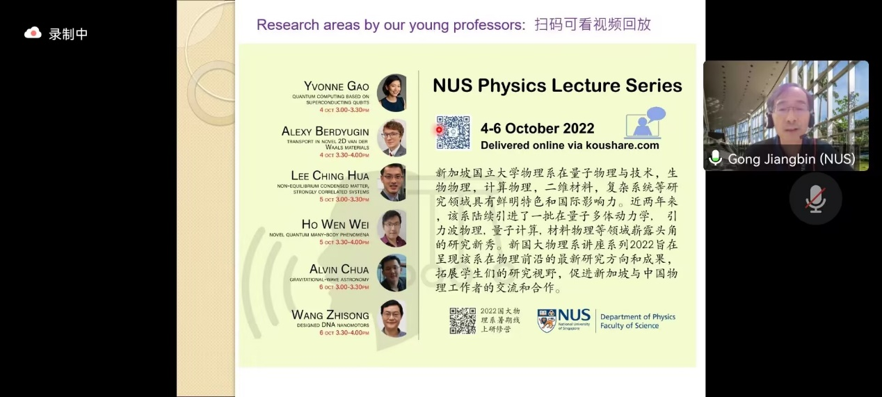 龚江滨教授首先为同学们简单介绍介绍了新加坡国立大学(下简称新国大)的校园环境与学科建设情况。据介绍,新国大物理系近年来引入了大批优秀人才,在量子物理与技术、生物物理、计算物理、二维材料、复杂系统等领域卓有建树。